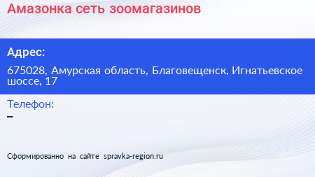 Амазонка, сеть зоомагазинов по адресу 675028, Амурская область, Благовещенск, Игнатьевское шоссе, 17 в дальнейшем Организация, размещена в следующих категориях: