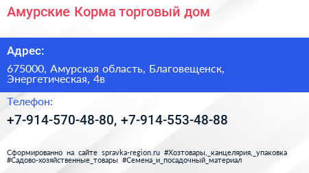 Амурские Корма, торговый дом по адресу 675000, Амурская область, Благовещенск, Энергетическая, 4в в дальнейшем Организация, размещена в следующих категориях: