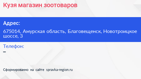 Кузя, магазин зоотоваров по адресу 675014, Амурская область, Благовещенск, Новотроицкое шоссе, 3 в дальнейшем Организация, размещена в следующих категориях: