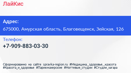 ЛайКис по адресу 675000, Амурская область, Благовещенск, Зейская, 126 в дальнейшем Организация, размещена в следующих категориях: