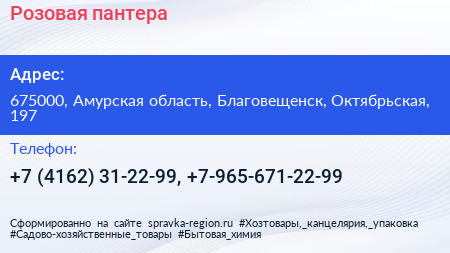 Розовая пантера по адресу 675000, Амурская область, Благовещенск, Октябрьская, 197 в дальнейшем Организация, размещена в следующих категориях:
