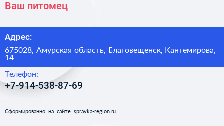 Ваш питомец по адресу 675028, Амурская область, Благовещенск, Кантемирова, 14 в дальнейшем Организация, размещена в следующих категориях: