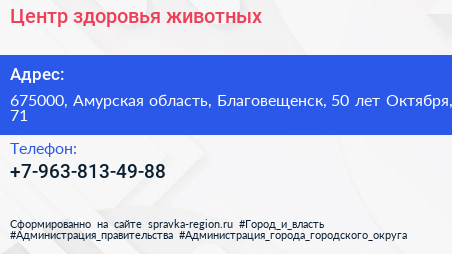 Центр здоровья животных по адресу 675000, Амурская область, Благовещенск, 50 лет Октября, 71 в дальнейшем Организация, размещена в следующих категориях: