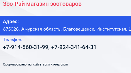 Зоо Рай, магазин зоотоваров по адресу 675028, Амурская область, Благовещенск, Институтская, 1 в дальнейшем Организация, размещена в следующих категориях: