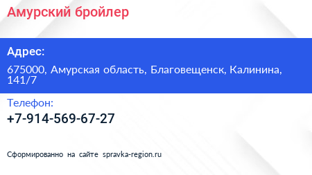 Амурский бройлер по адресу 675000, Амурская область, Благовещенск, Калинина, 141/7 в дальнейшем Организация, размещена в следующих категориях: