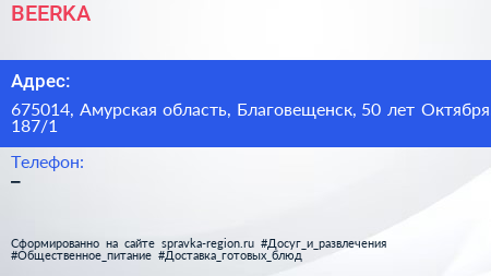 BEERKA по адресу 675014, Амурская область, Благовещенск, 50 лет Октября, 187/1 в дальнейшем Организация, размещена в следующих категориях: