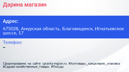 Дарина, магазин по адресу 675028, Амурская область, Благовещенск, Игнатьевское шоссе, 17 в дальнейшем Организация, размещена в следующих категориях: