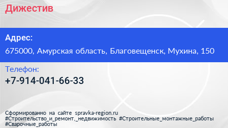 Дижестив по адресу 675000, Амурская область, Благовещенск, Мухина, 150 в дальнейшем Организация, размещена в следующих категориях: