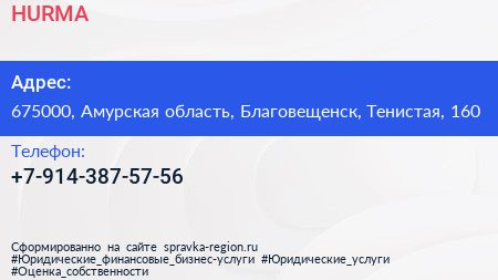 HURMA по адресу 675000, Амурская область, Благовещенск, Тенистая, 160 в дальнейшем Организация, размещена в следующих категориях: