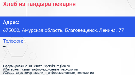 Хлеб из тандыра, пекарня по адресу 675002, Амурская область, Благовещенск, Ленина, 77 в дальнейшем Организация, размещена в следующих категориях:
