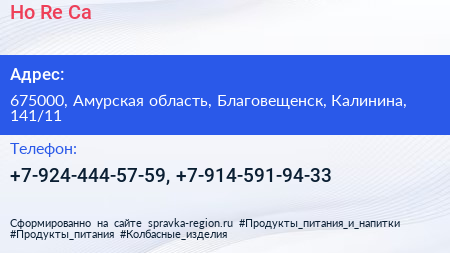 Ho Re Ca по адресу 675000, Амурская область, Благовещенск, Калинина, 141/11 в дальнейшем Организация, размещена в следующих категориях: