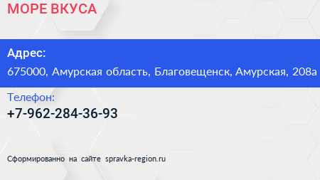 МОРЕ ВКУСА по адресу 675000, Амурская область, Благовещенск, Амурская, 208а в дальнейшем Организация, размещена в следующих категориях: