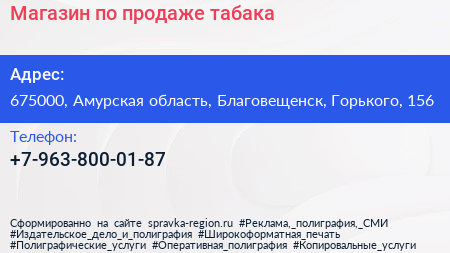 Магазин по продаже табака по адресу 675000, Амурская область, Благовещенск, Горького, 156 в дальнейшем Организация, размещена в следующих категориях:
