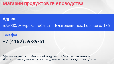 Магазин продуктов пчеловодства по адресу 675000, Амурская область, Благовещенск, Горького, 135 в дальнейшем Организация, размещена в следующих категориях: