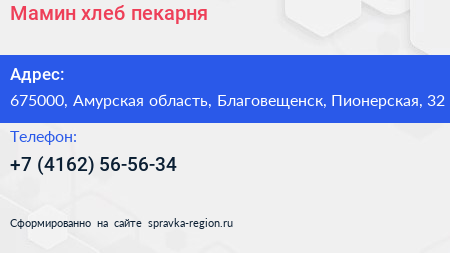 Мамин хлеб, пекарня по адресу 675000, Амурская область, Благовещенск, Пионерская, 32 в дальнейшем Организация, размещена в следующих категориях:
