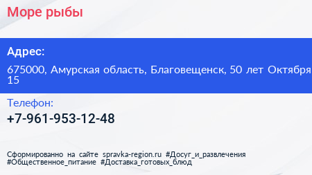 Море рыбы по адресу 675000, Амурская область, Благовещенск, 50 лет Октября, 15 в дальнейшем Организация, размещена в следующих категориях: