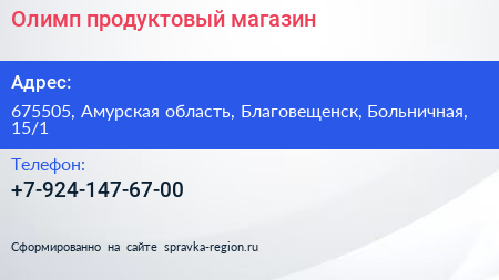 Олимп, продуктовый магазин по адресу 675505, Амурская область, Благовещенск, Больничная, 15/1 в дальнейшем Организация, размещена в следующих категориях: