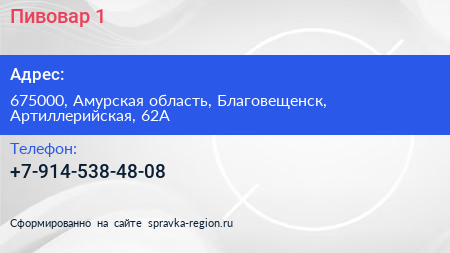 Пивовар №1 по адресу 675000, Амурская область, Благовещенск, Артиллерийская, 62А в дальнейшем Организация, размещена в следующих категориях: