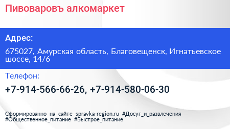 Пивоваровъ, алкомаркет по адресу 675027, Амурская область, Благовещенск, Игнатьевское шоссе, 14/6 в дальнейшем Организация, размещена в следующих категориях: