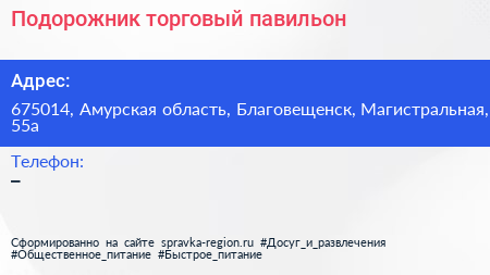 Подорожник, торговый павильон по адресу 675014, Амурская область, Благовещенск, Магистральная, 55а в дальнейшем Организация, размещена в следующих категориях: