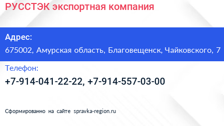 РУССТЭК, экспортная компания по адресу 675002, Амурская область, Благовещенск, Чайковского, 7 в дальнейшем Организация, размещена в следующих категориях: