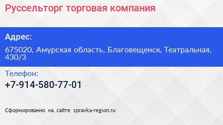 Руссельторг, торговая компания по адресу 675020, Амурская область, Благовещенск, Театральная, 430/3 в дальнейшем Организация, размещена в следующих категориях: