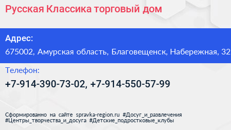 Русская Классика, торговый дом по адресу 675002, Амурская область, Благовещенск, Набережная, 32 в дальнейшем Организация, размещена в следующих категориях: