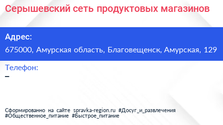 Серышевский, сеть продуктовых магазинов по адресу 675000, Амурская область, Благовещенск, Амурская, 129 в дальнейшем Организация, размещена в следующих категориях:
