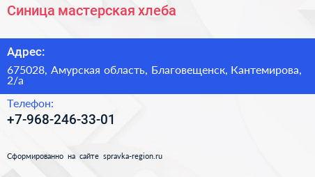 Синица, мастерская хлеба по адресу 675028, Амурская область, Благовещенск, Кантемирова, 2/а в дальнейшем Организация, размещена в следующих категориях: