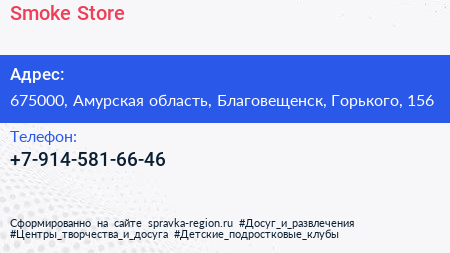 Smoke Store по адресу 675000, Амурская область, Благовещенск, Горького, 156 в дальнейшем Организация, размещена в следующих категориях:
