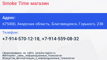 Smoke Time, магазин по адресу 675000, Амурская область, Благовещенск, Горького, 238 в дальнейшем Организация, размещена в следующих категориях: