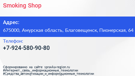 Smoking Shop по адресу 675000, Амурская область, Благовещенск, Пионерская, 64 в дальнейшем Организация, размещена в следующих категориях: