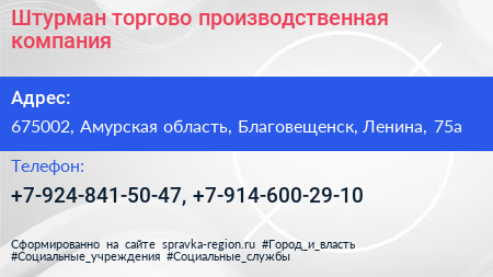 Штурман, торгово-производственная компания по адресу 675002, Амурская область, Благовещенск, Ленина, 75а в дальнейшем Организация, размещена в следующих категориях: