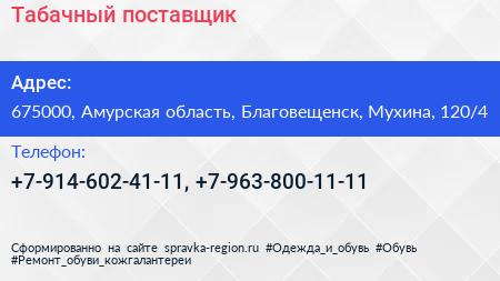 Табачный поставщик по адресу 675000, Амурская область, Благовещенск, Мухина, 120/4 в дальнейшем Организация, размещена в следующих категориях:
