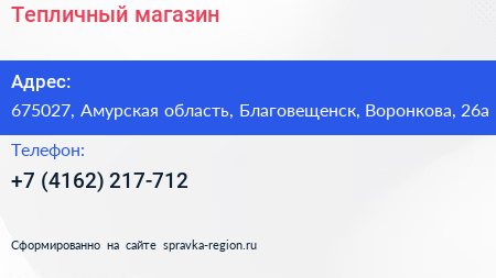 Тепличный, магазин по адресу 675027, Амурская область, Благовещенск, Воронкова, 26а в дальнейшем Организация, размещена в следующих категориях:
