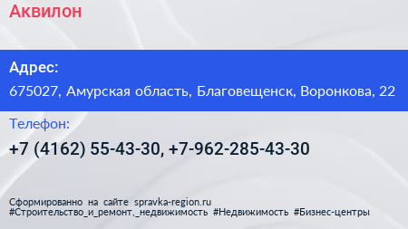 Аквилон+ по адресу 675027, Амурская область, Благовещенск, Воронкова, 22 в дальнейшем Организация, размещена в следующих категориях: