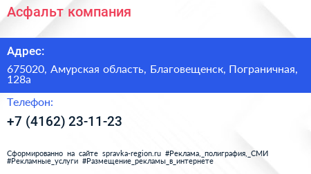 Асфальт, компания по адресу 675020, Амурская область, Благовещенск, Пограничная, 128а в дальнейшем Организация, размещена в следующих категориях: