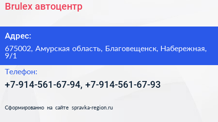 Brulex, автоцентр по адресу 675002, Амурская область, Благовещенск, Набережная, 9/1 в дальнейшем Организация, размещена в следующих категориях: