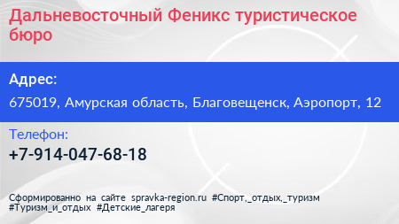 Дальневосточный Феникс, туристическое бюро по адресу 675019, Амурская область, Благовещенск, Аэропорт, 12 в дальнейшем Организация, размещена в следующих категориях: