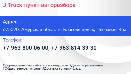 J.Truck, пункт авторазбора по адресу 675020, Амурская область, Благовещенск, Песчаная, 45а в дальнейшем Организация, размещена в следующих категориях:
