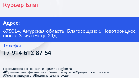 Курьер-Благ по адресу 675014, Амурская область, Благовещенск, Новотроицкое шоссе 3 километр, 21д в дальнейшем Организация, размещена в следующих категориях: