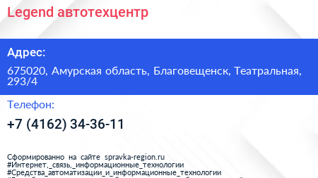 Legend, автотехцентр по адресу 675020, Амурская область, Благовещенск, Театральная, 293/4 в дальнейшем Организация, размещена в следующих категориях: