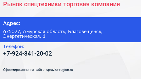 Рынок спецтехники, торговая компания по адресу 675027, Амурская область, Благовещенск, Энергетическая, 1 в дальнейшем Организация, размещена в следующих категориях: