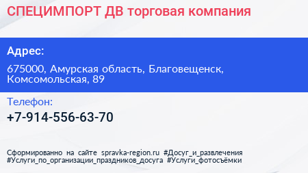 СПЕЦИМПОРТ-ДВ, торговая компания по адресу 675000, Амурская область, Благовещенск, Комсомольская, 89 в дальнейшем Организация, размещена в следующих категориях: