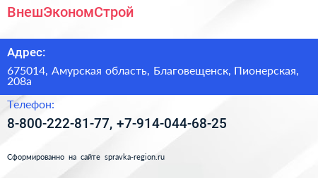 ВнешЭкономСтрой по адресу 675014, Амурская область, Благовещенск, Пионерская, 208а в дальнейшем Организация, размещена в следующих категориях:
