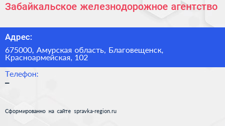 Забайкальское железнодорожное агентство по адресу 675000, Амурская область, Благовещенск, Красноармейская, 102 в дальнейшем Организация, размещена в следующих категориях: