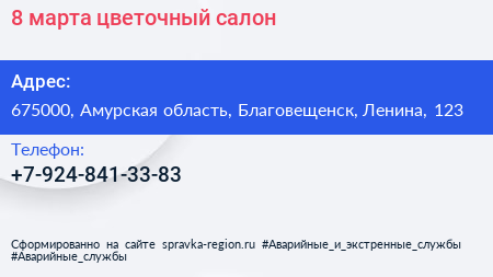8 марта, цветочный салон по адресу 675000, Амурская область, Благовещенск, Ленина, 123 в дальнейшем Организация, размещена в следующих категориях: