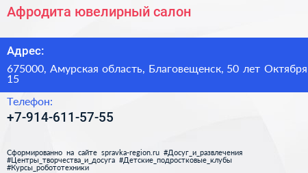 Афродита, ювелирный салон по адресу 675000, Амурская область, Благовещенск, 50 лет Октября, 15 в дальнейшем Организация, размещена в следующих категориях: