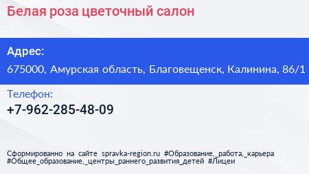 Белая роза, цветочный салон по адресу 675000, Амурская область, Благовещенск, Калинина, 86/1 в дальнейшем Организация, размещена в следующих категориях:
