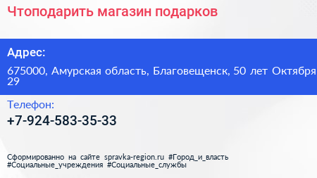 Чтоподарить, магазин подарков по адресу 675000, Амурская область, Благовещенск, 50 лет Октября, 29 в дальнейшем Организация, размещена в следующих категориях: